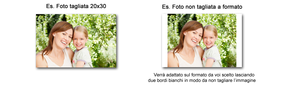 Il processo di stampa delle vostre foto avverrà totalmente in maniera automatica, ogni file viene sottoposto ad un processo di correzione automatica che ne ottimizza luminosità e contrasto. Inoltre in base al formato di stampa scelto, se il file risulta fuori formato quindi di diverso formato da quello scelto, il sistema aggiunge 2 bande bianche su due dei lati come in figura.